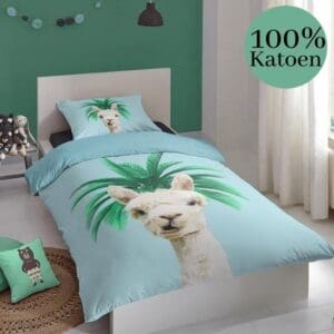 Droomtextiel Dekbedovertrek Kinderen Palm Lama Blauw - 140x200/220cm - 100% Zacht Katoen