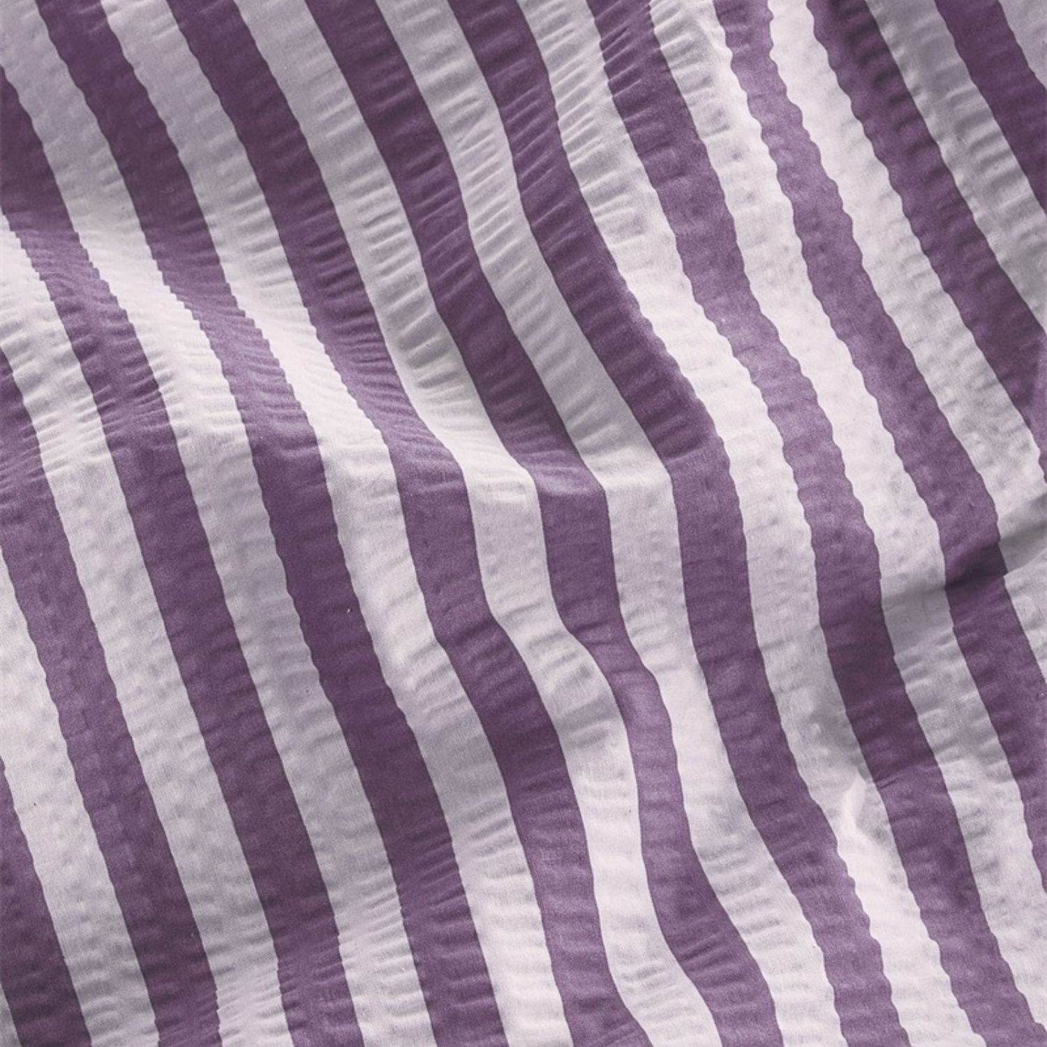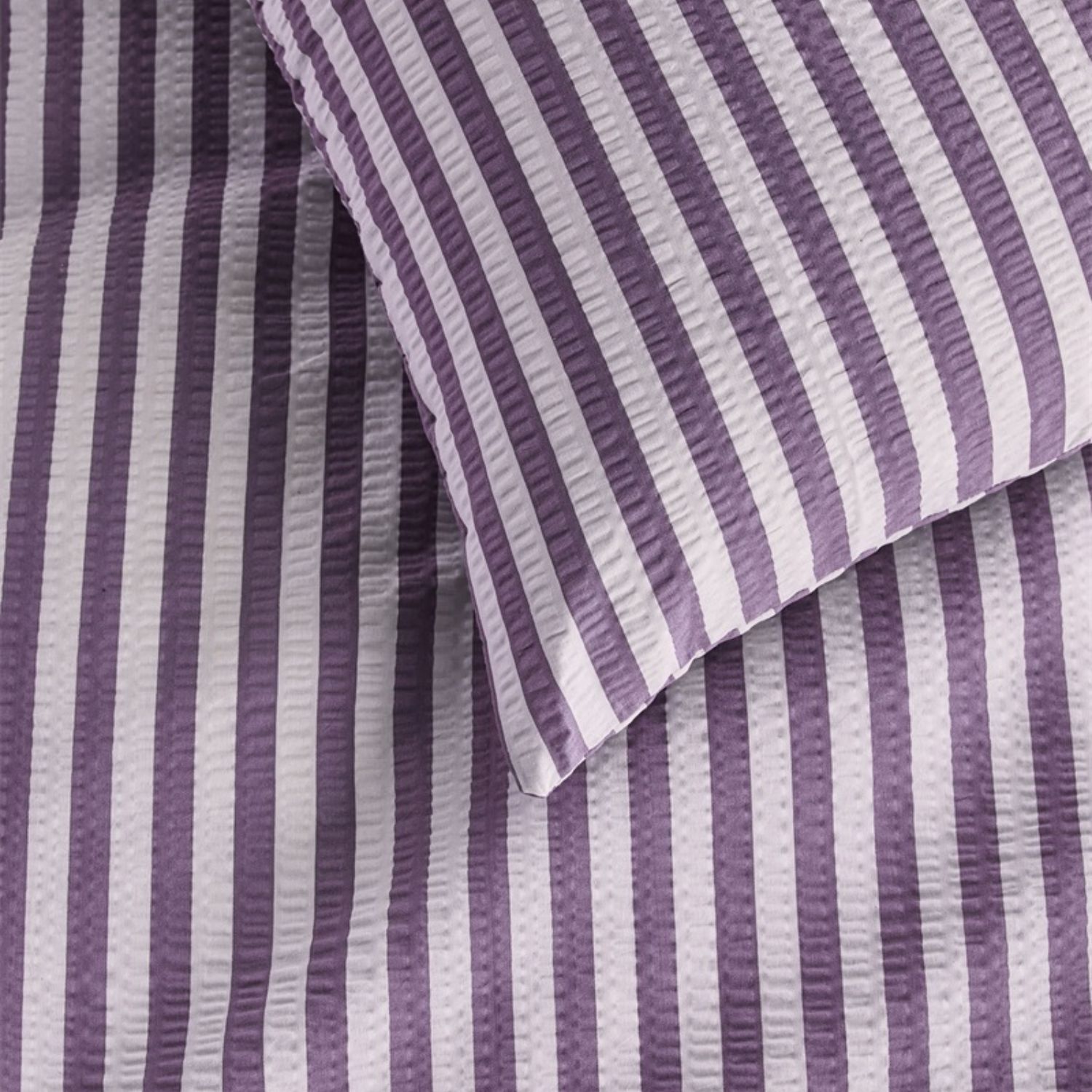 Dekbedovertrek Veya valt op door verticale strepen met een licht geribbelde structuur, wat zorgt voor een speels en levendig effect. De frisse, paarse versterken het gevoel van hoogte en ruimte in de slaapkamer. De subtiele kreuk in de stof geeft het geheel een ontspannen en eigentijdse uitstraling die perfect past binnen een moderne woonstijl.