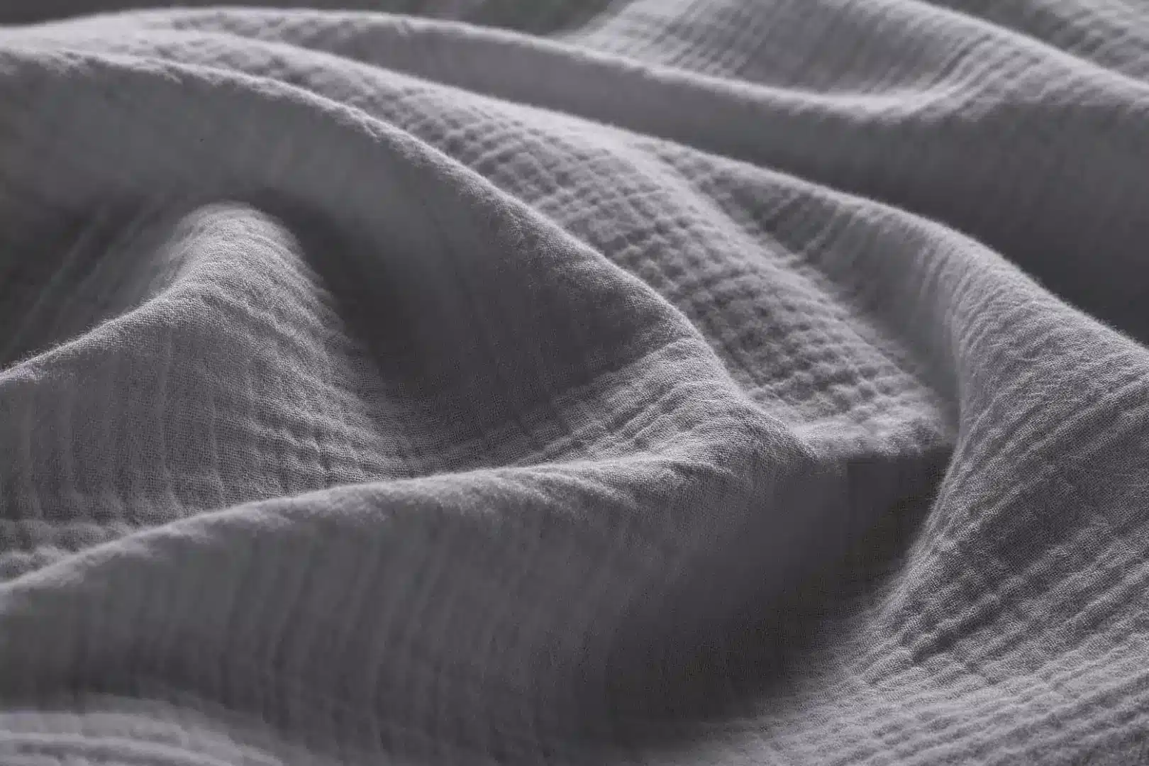 Mousseline, ook wel double gauze genoemd, is een unieke stof die bestaat uit twee fijne lagen los geweven katoen. Deze zijn op enkele punten subtiel met elkaar verbonden, waardoor een karakteristieke, natuurlijke kreukstructuur ontstaat – het bekende crinkle-effect.