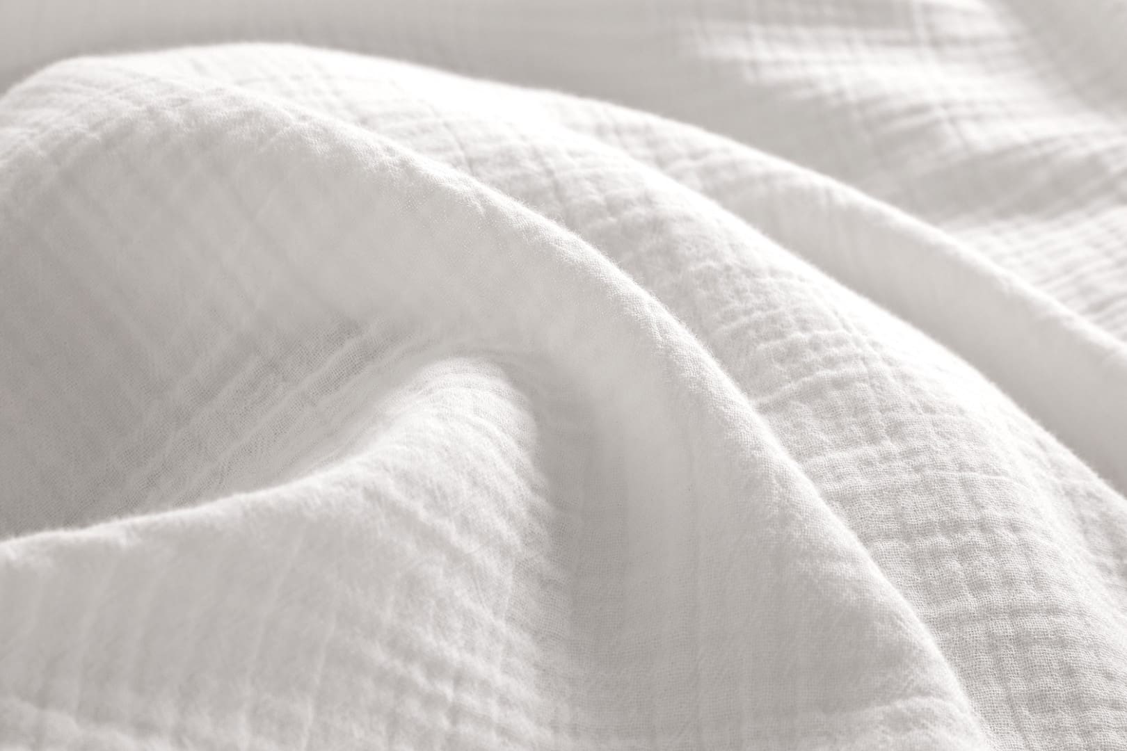 Mousseline, ook wel double gauze genoemd, is een unieke stof die bestaat uit twee fijne lagen los geweven katoen. Deze zijn op enkele punten subtiel met elkaar verbonden, waardoor een karakteristieke, natuurlijke kreukstructuur ontstaat – het bekende crinkle-effect.