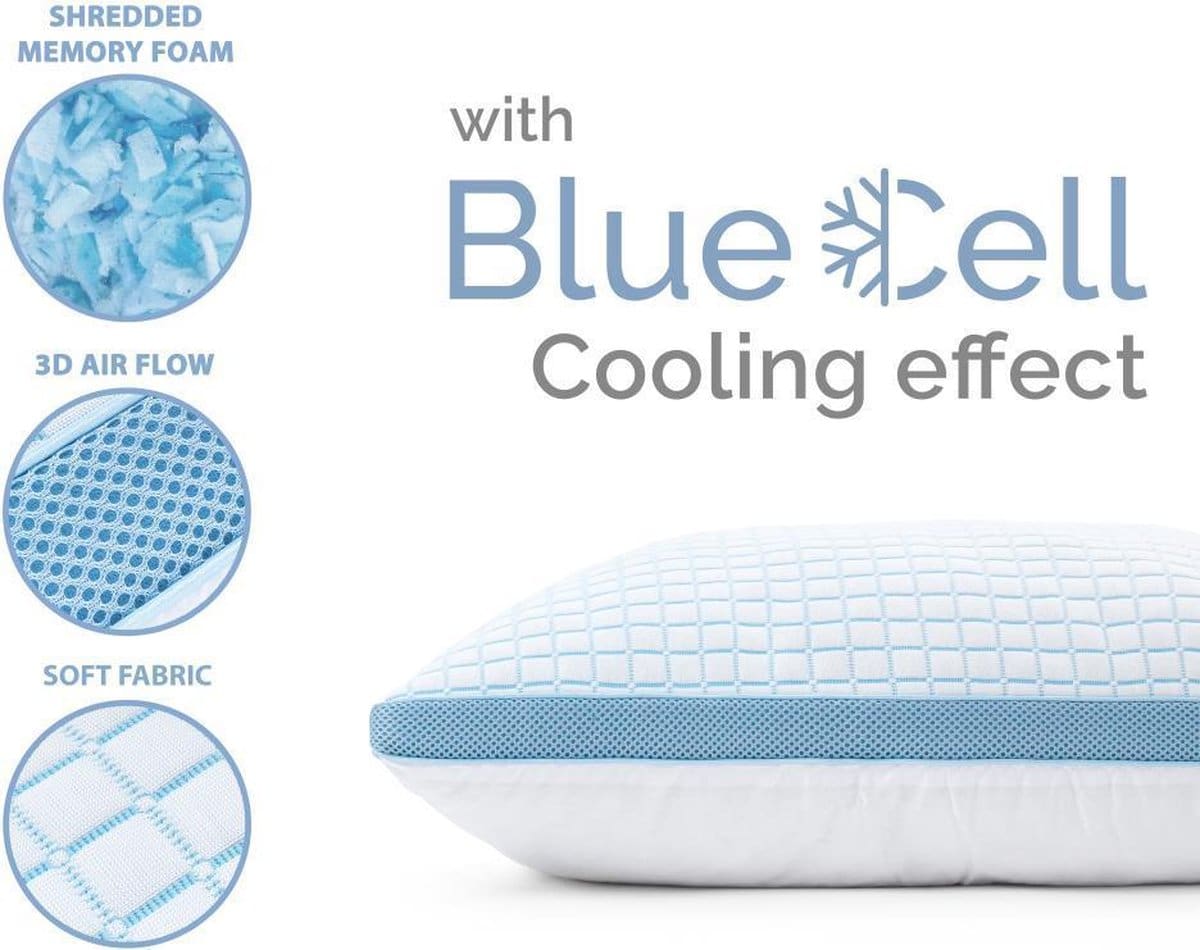 De bovenzijde is gemaakt van een ademende mix van 55% nylon en 45% polyester met verkoelende Blue Cell Tech, terwijl de onderzijde van 100% percale katoen zorgt voor een zacht en fris gevoel. Het luxe doorgestikte ontwerp, de blauwe bies en de 3D-ventilatieband maken dit kussen niet alleen functioneel, maar ook stijlvol.
