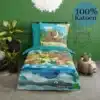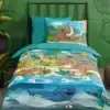 Met de Prehistoric-print breng je de fascinerende wereld van dino’s direct naar de kinderkamer. De voorzijde toont machtige T-rex’en, triceratops en zeereptielen, terwijl de achterkant een fijn patroon van kleine, stilistische dino’s in blauwgroene tinten heeft. Zo geniet je van een spannend én rustgevend design – ideaal om in dromenland te verdwalen.