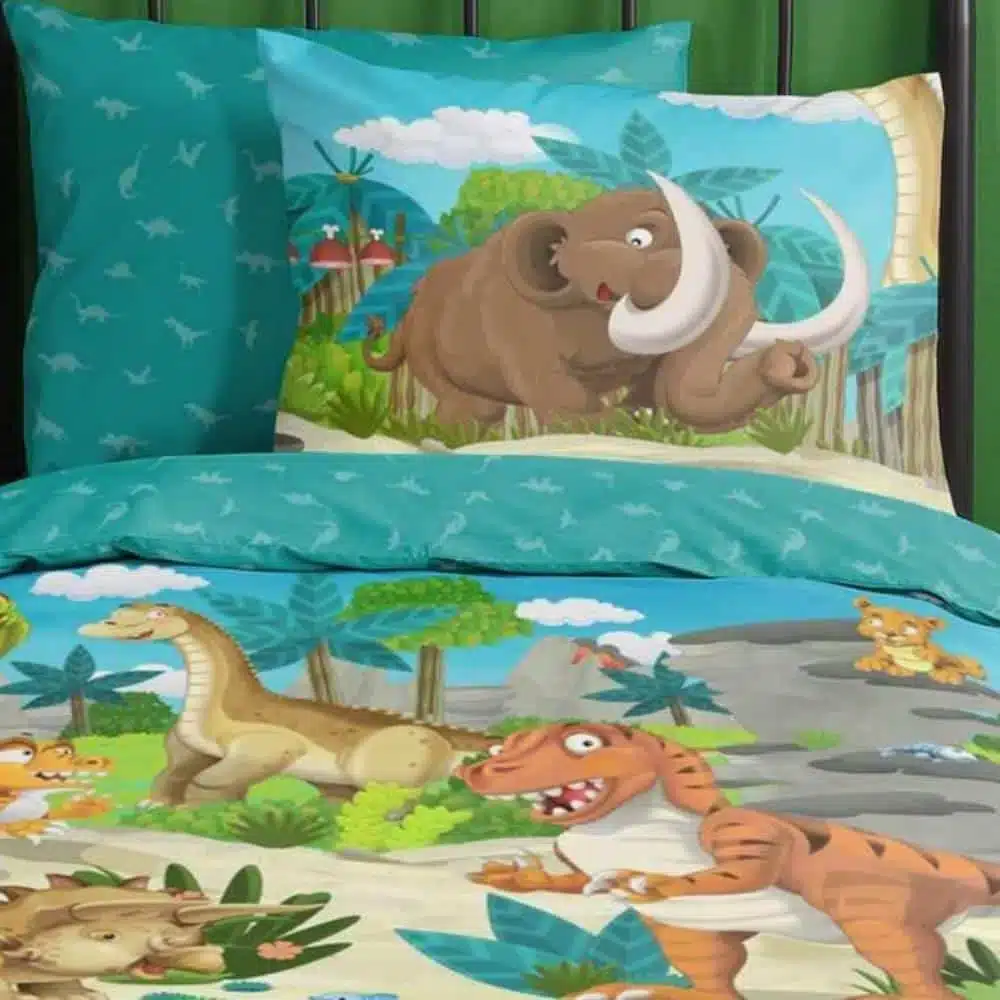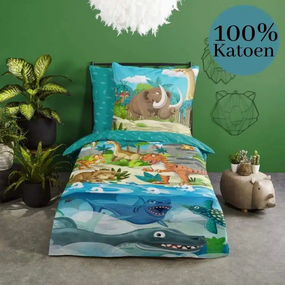 • Design: “Prehistoric” – vrolijke dino’s op land en in zee, mammoet op kussensloop, achterkant blauwgroen met mini‑dino’s