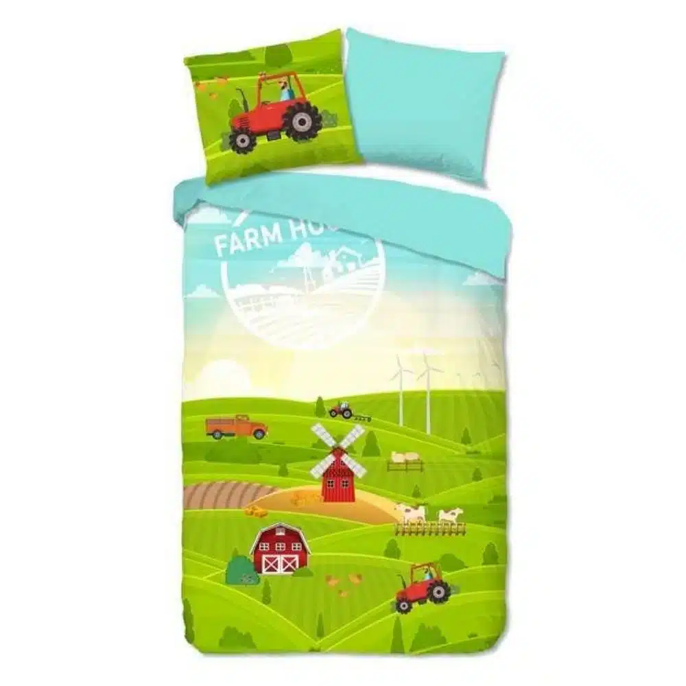- Farm dekbedovertrek Pieter: levendig boerenlandschap & effen lichtblauwe achterzijde.