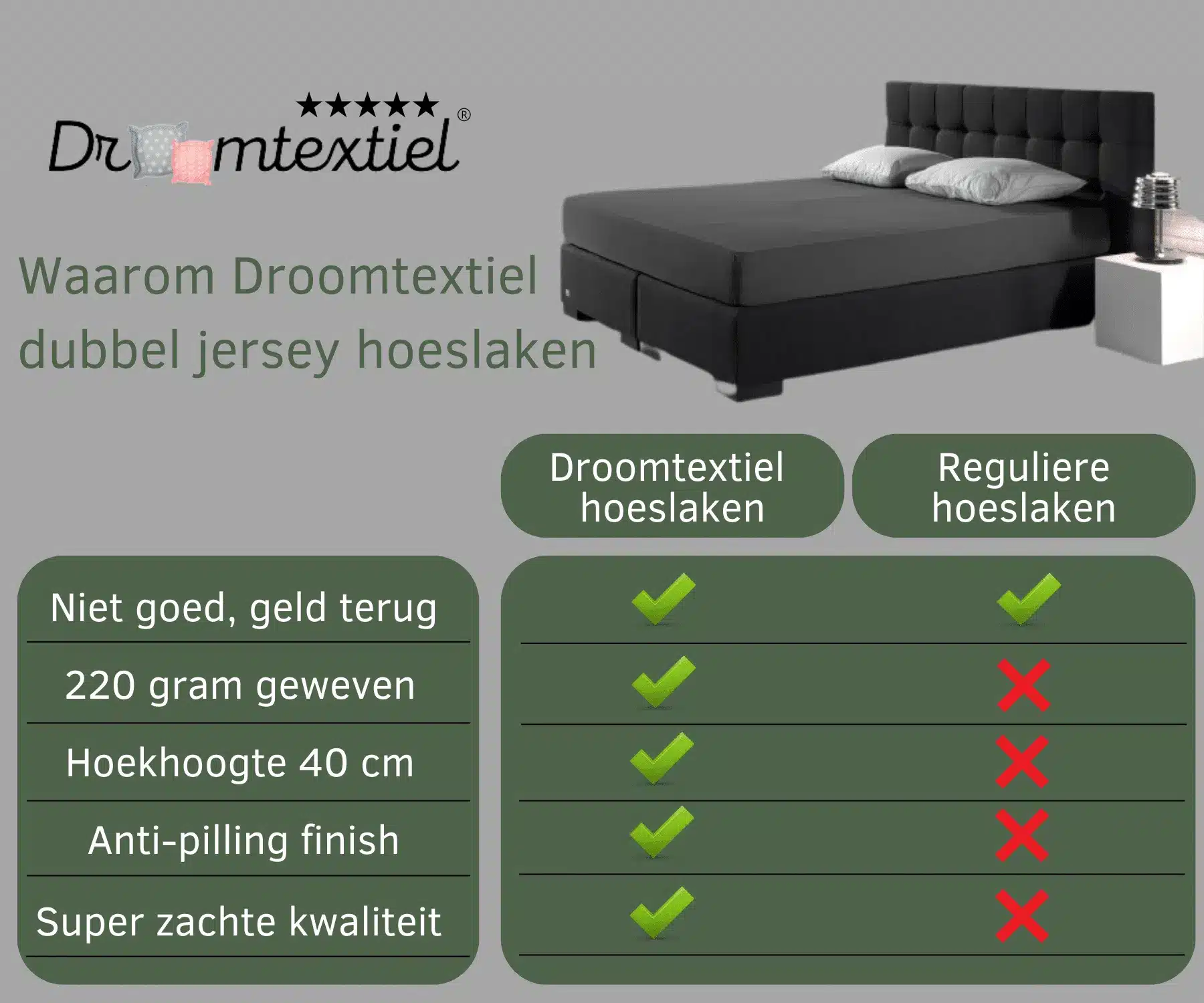 In de onderstaande tabel zie je in één oogopslag waarom het Droomtextiel Dubbel Jersey Hoeslaken zich onderscheidt van gangbare hoeslakens in katoen satijn of standaard jersey: