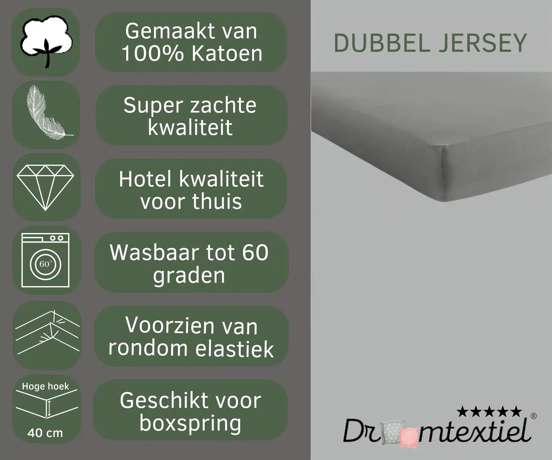 Het Droomtextiel Dubbel Jersey Hoeslaken combineert de luxe van beddengoed hotelkwaliteit met de duurzaamheid en betrouwbaarheid waar Droomtextiel voor staat. Dankzij de 100% katoen dubbeldikke weving geniet je van ademend vermogen, vochtregulatie, antiallergische eigenschappen en een perfecte pasvorm voor matrassen tot 40 cm. Het strijkvrije gemak en de hoge wasbaarheid maken het onderhoud moeiteloos.