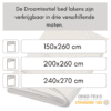 - Maten: 90×200, 150×260, 200×260, 240×270