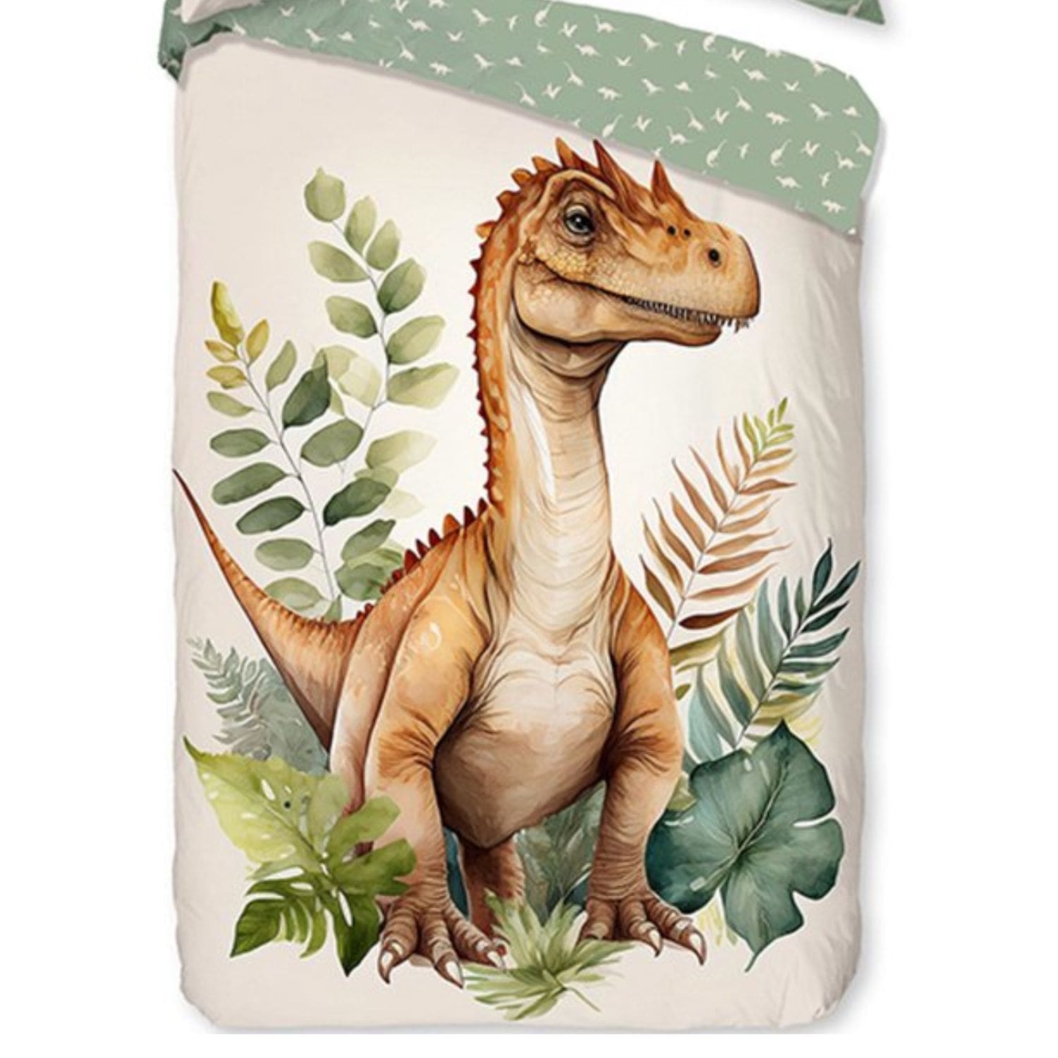 Breng avontuur naar de slaapkamer van je kleintje met dit Good Morning kinderdekbedovertrek. Het ontwerp is perfect voor jonge dino-liefhebbers, met een schattige en gedetailleerde illustratie van een dino omringd door weelderige groene bladeren. De frisse groene tinten op de achterkant van het dekbedovertrek geven het een rustgevende en speelse uitstraling.