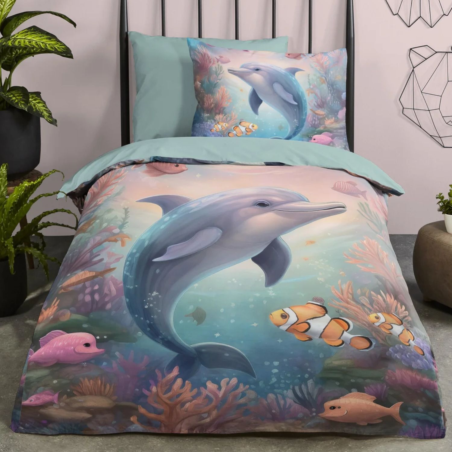 Laat dromen tot leven komen met het vrolijke Good Morning kinderdekbedovertrek Baya! Dit kleurrijke overtrek brengt de onderwaterwereld naar de slaapkamer, met een speelse print van een dolfijn en vrolijke vissen. Perfect voor kleine dierenliefhebbers en een echte blikvanger in iedere kinderkamer.