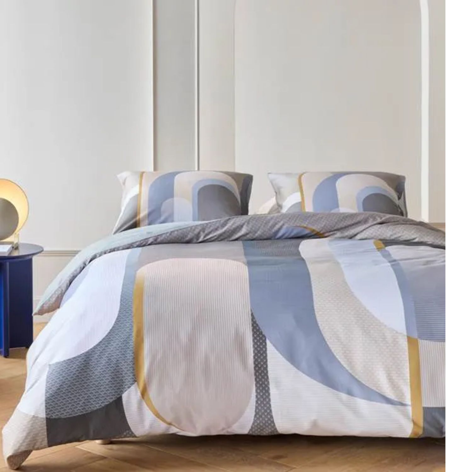 Kardol Archi Dekbedovertrek Blauwgrijs Met het Kardol Archi dekbedovertrek geef je jouw slaapkamer direct een luxe en moderne uitstraling. Het overtrek heeft een elegante grafische print in zachte, warme tinten. De ronde vormen overlappen elkaar subtiel en zorgen voor een chique en stijlvolle look. De achterzijde is effen blauwgrijs, waardoor je makkelijk een rustige omslag kunt maken.