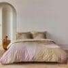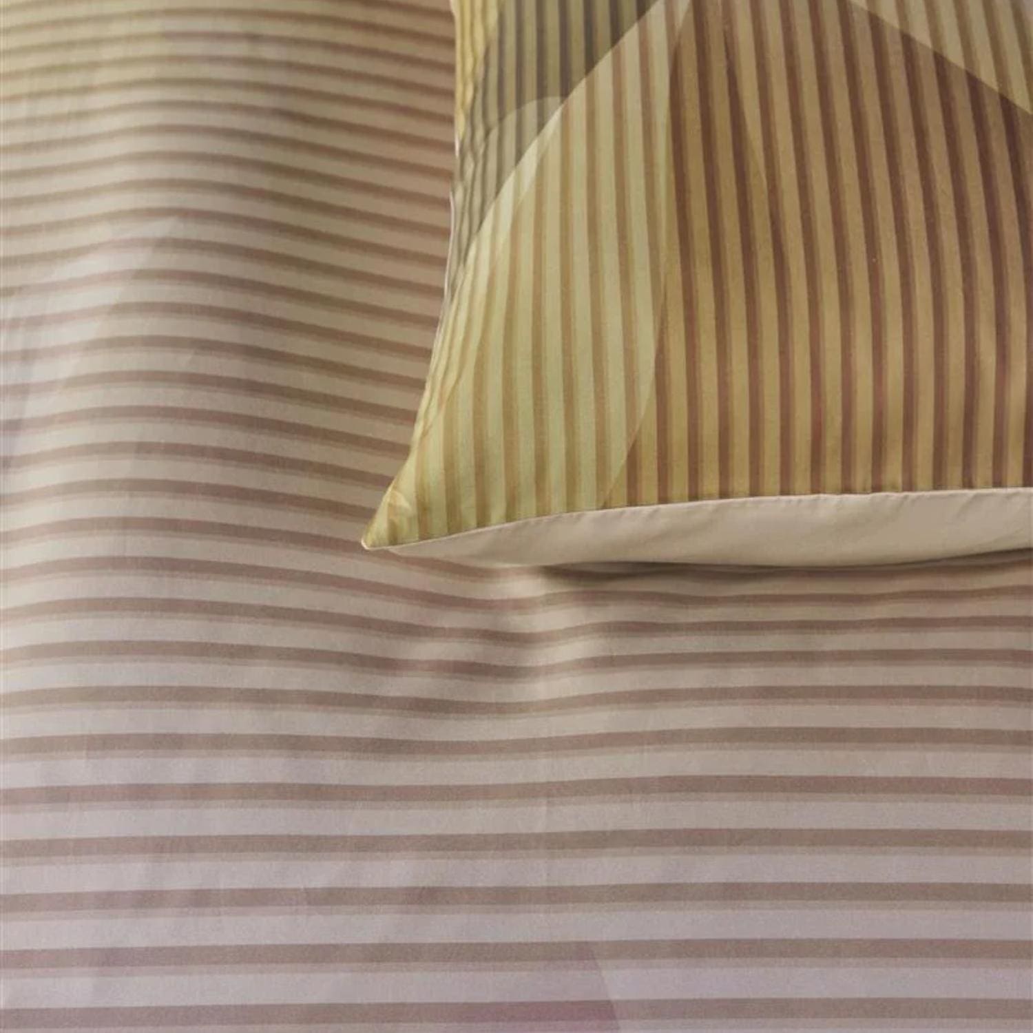 Dekbedovertrek Illuminate van Kardol by Beddinghouse schittert door vloeiende vormen die met licht en kleur spelen. Geïnspireerd door kunst, mode en architectuur, vangt dit ontwerp de innovatieve vormentaal van Artificial Intelligence, maar dan met de hand vervaardigd. Het ton-sur-ton streepmotief voegt diepte en elegantie toe, waardoor het geheel een betoverende uitstraling krijgt. De kleuren variëren van warm goud en terra tot nude, zachtroze en diep bordeauxrood. De achterzijde heeft een effen champagnekleur.