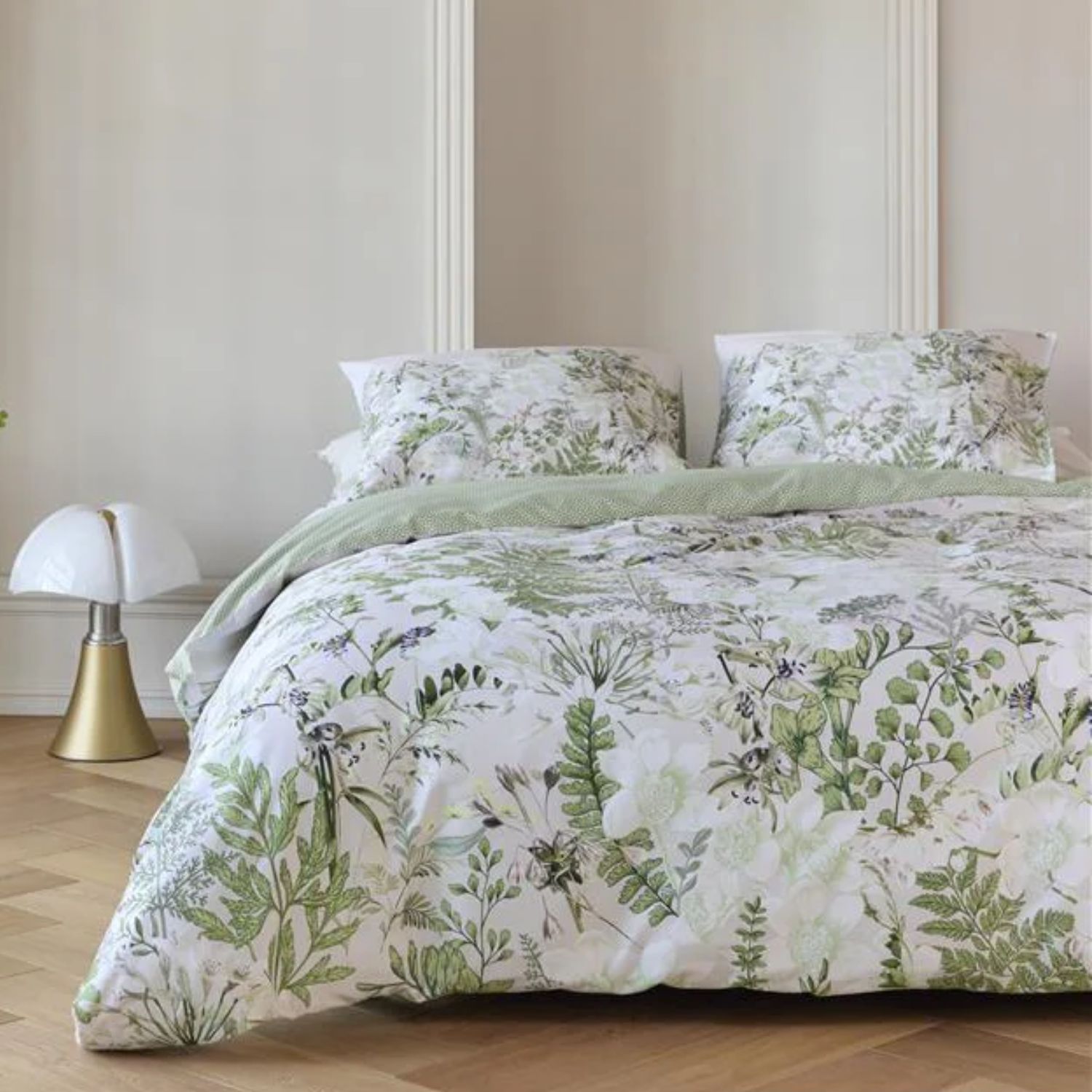 Het Kardol Pastiche dekbedovertrek is een luxe dubbelzijdig ontwerp dat je slaapkamer een verfijnde en stijlvolle uitstraling geeft. De voorzijde toont een rijke botanische print met takken en bloemen, terwijl de achterzijde is voorzien van een subtiel, verfijnd motief dat mooi aansluit op het bloemrijke dessin. Dankzij de lichte champagnekleurige basis, gecombineerd met vergrijsd groen en subtiel geel, creëert dit overtrek een frisse en elegante sfeer. De effen baan aan de bovenzijde zorgt voor een rustige afwerking – ideaal in combinatie met een gekleurd hoofdbord.