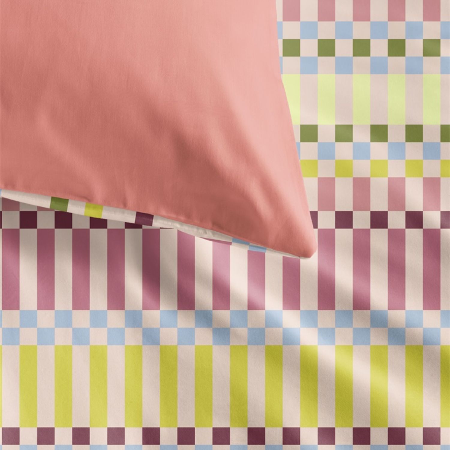 Dekbedovertrek Jaci brengt een speelse en vrolijke sfeer in de slaapkamer met kleurrijke grafische elementen. Het moderne ontwerp combineert zachte tinten die warmte en gezelligheid uitstralen, waardoor het moeiteloos past binnen diverse interieurstijlen.