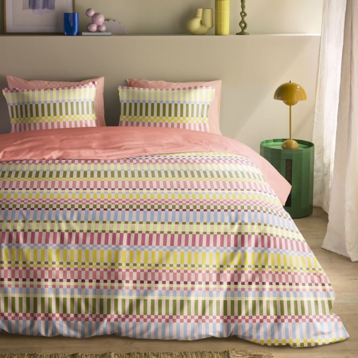 Dekbedovertrek Jaci brengt een speelse en vrolijke sfeer in de slaapkamer met kleurrijke grafische elementen. Het moderne ontwerp combineert zachte tinten die warmte en gezelligheid uitstralen, waardoor het moeiteloos past binnen diverse interieurstijlen.
