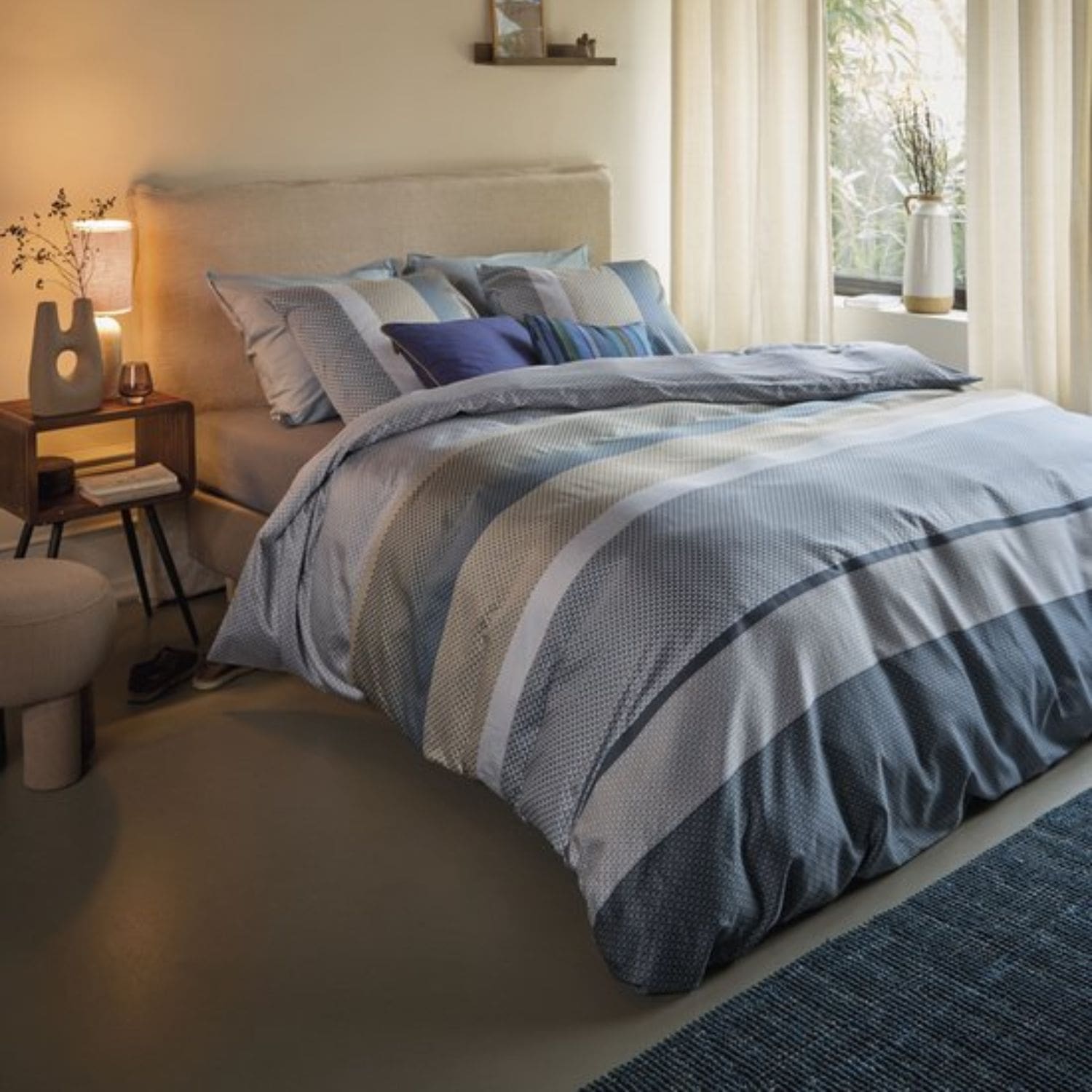 Droom heerlijk weg onder het stijlvolleBeddinghouse Marthe dekbedovertrek. Het dessin bestaat uit een modern banenpatroon in rustgevende blauw- en aardetinten. Van dichtbij zie je subtiele grafische details die het geheel een eigentijdse en speelse twist geven. Dankzij dit rustige kleurpalet past het dekbedovertrek moeiteloos in diverse interieurstijlen.