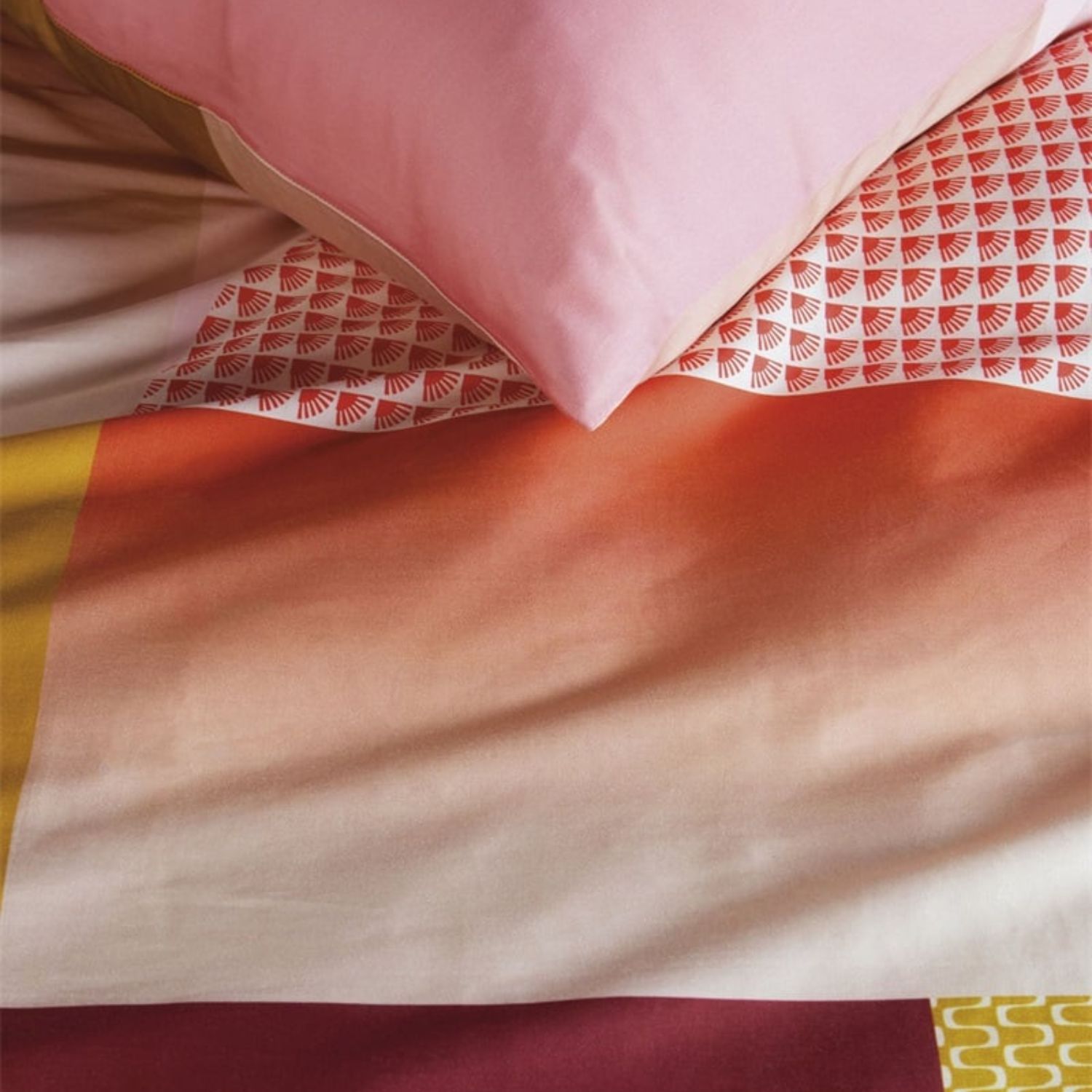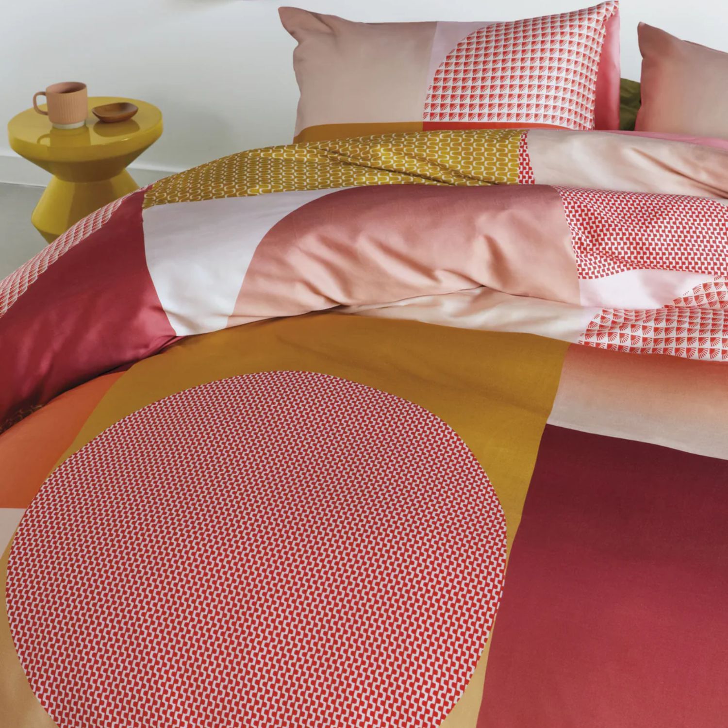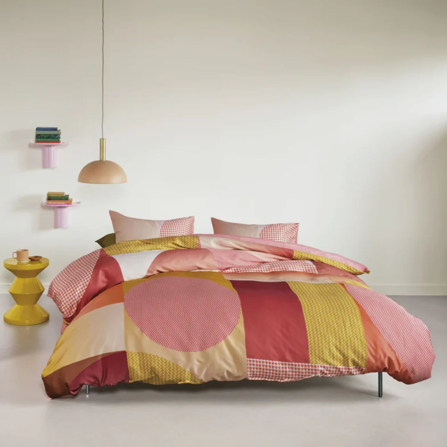 Breng kleur, warmte en kunstzinnige flair in je slaapkamer met het Beddinghouse Sunset Boulevard dekbedovertrek uit de Dutch Design collectie. Dit opvallende ontwerp is een echte eyecatcher dankzij de cirkels, geometrische vlakken en textuurpatronen die samen een dynamisch en harmonieus geheel vormen. De levendige koraaltinten gecombineerd met gouden accenten geven het dessin een luxueuze uitstraling en maken van jouw bed het stralende middelpunt van de kamer. De effen achterzijde maakt het mogelijk een stijlvolle omslag te creëren voor een extra verfijnde look. Het Sunset Boulevard dekbedovertrek is gemaakt van 70% lyocell (Tencel) en 30% katoen-satijn, een hoogwaardige en duurzame combinatie. Lyocell, afkomstig uit de eucalyptusboom, is van nature ademend, vochtabsorberend, antibacterieel en huidvriendelijk. In combinatie met katoen-satijn ontstaat een stof met een prachtige glans en een zijdezachte touch, voor een ultiem gevoel van comfort. Dankzij de dubbel doorlopende instopstrook blijft het dekbedovertrek netjes op zijn plaats, ook bij extra lange dekbedden. De totale lengte van circa 260 cm maakt het geschikt voor alle lengtematen.