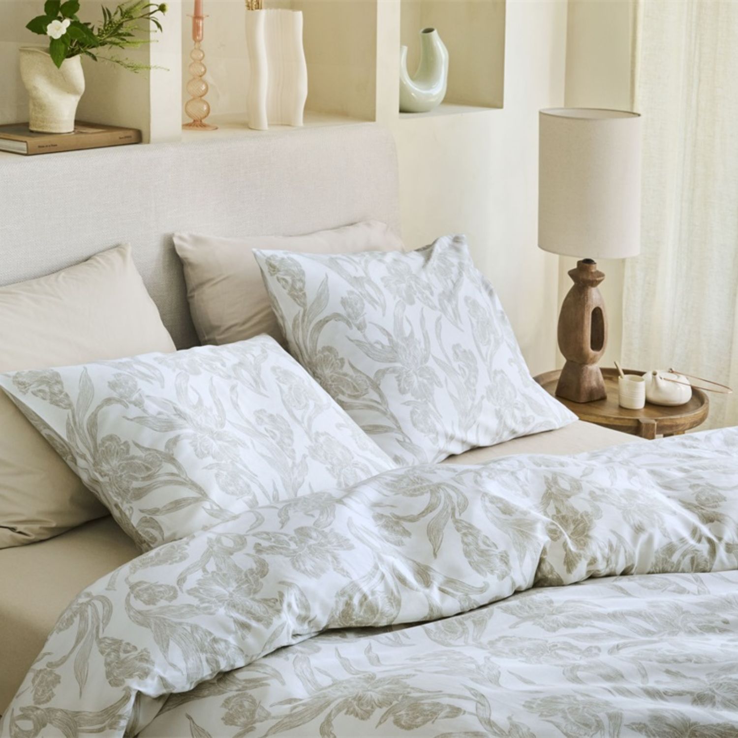 Breng rust en verfijning in je slaapkamer met het Beddinghouse Irys dekbedovertrek in zand. Het sierlijke bloemenpatroon in een zachte, frisse kleurstelling geeft het overtrek een romantische en serene uitstraling. De subtiele Scandinavische stijl combineert eenvoud met elegantie en creëert een lichte, kalme sfeer waarin je iedere avond ontspannen in slaap valt.