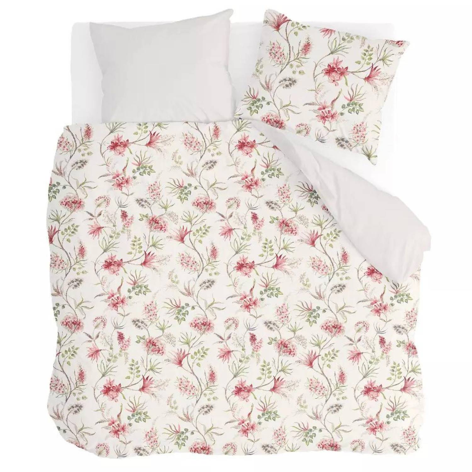 Het Spring Beauty dekbedovertrek vangt de essentie van de lente in een elegant design. Op de voorzijde zie je verfijnde rode en roze bloemblaadjes, omlijst door subtiele lichtgroene bladeren. De witte achterkant geeft je de keuze voor een rustige, minimalistische look. Zo wissel je af tussen een kleurrijke lenteboho-sfeer en een serene hotelstijl.