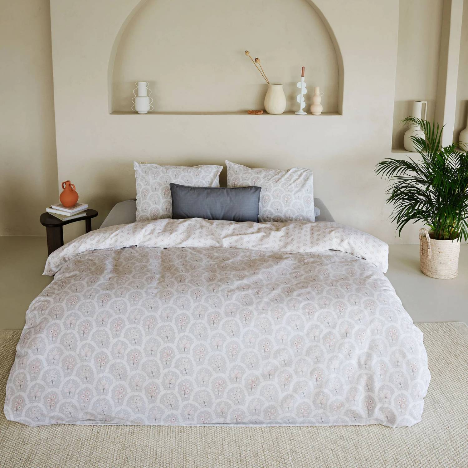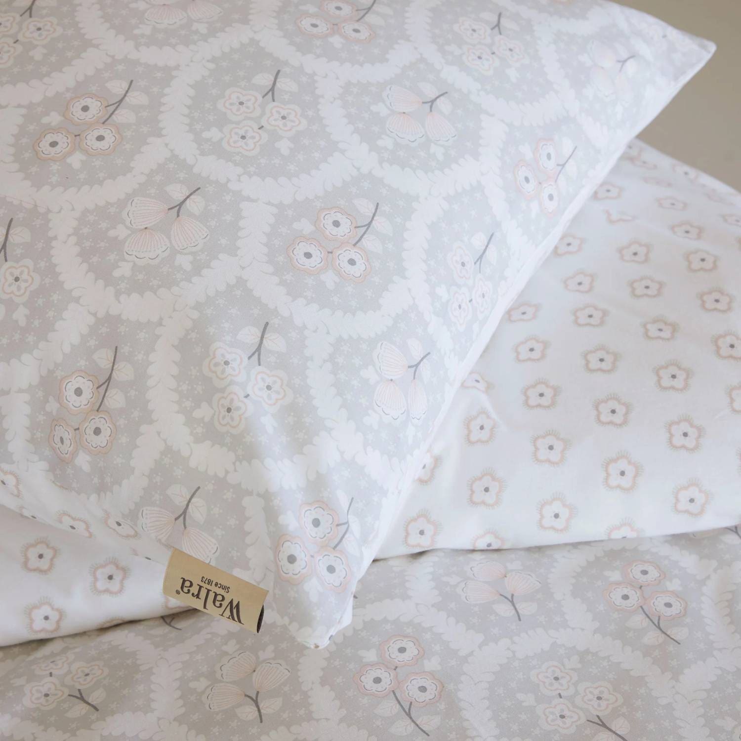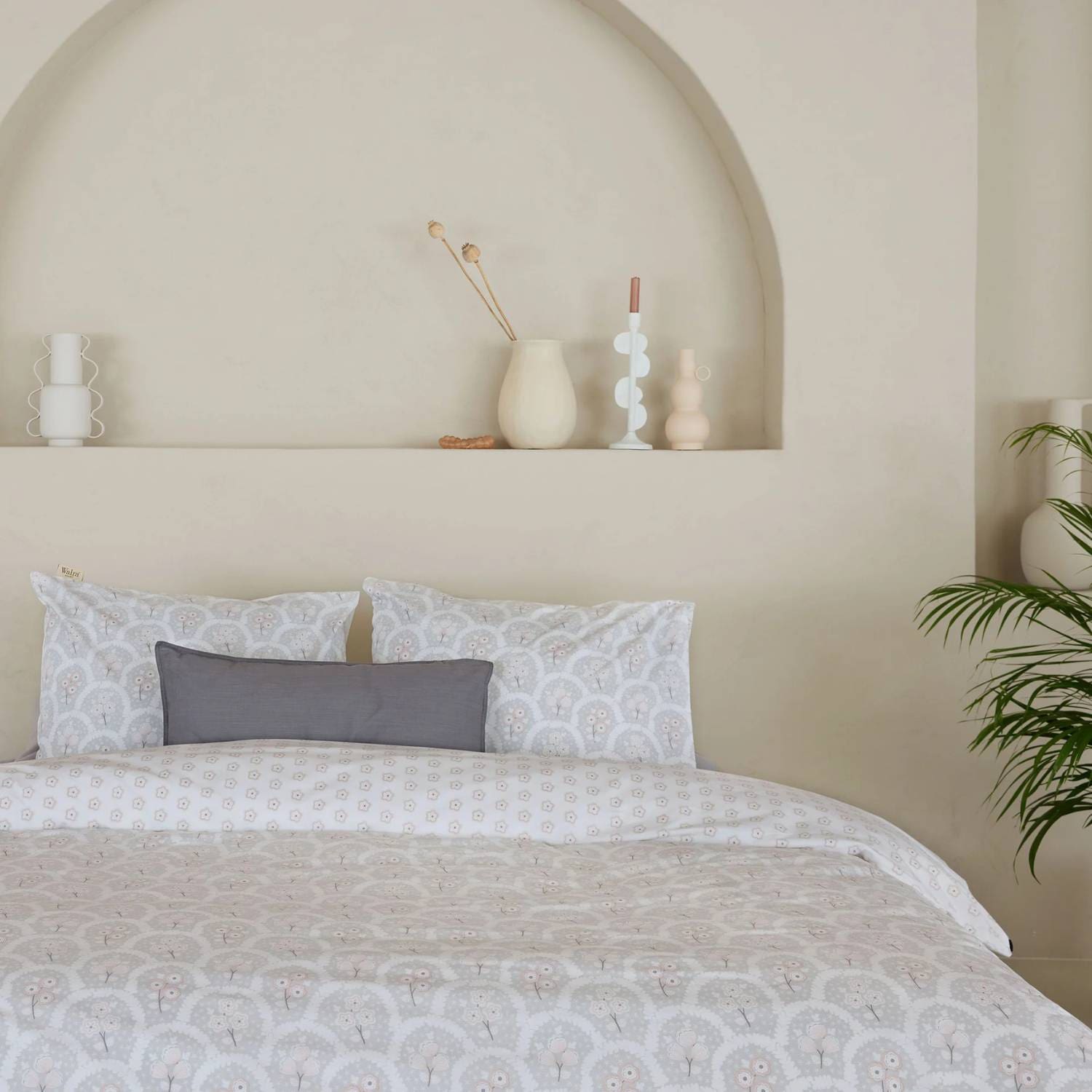 De ene zijde van het overtrek is versierd met een fleurige print van talrijke bloemetjes die elegant in witte boogjes lijken te zijn gevlochten. Een subtiel contrast tussen de gevlochten motieven en de lichtgrijze achtergrond zorgt voor een chique uitstraling.