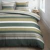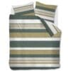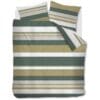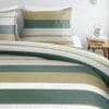 Het dessin van Dani is tijdloos en toch verrassend. Warme groene tinten, afgewisseld in smalle en brede horizontale strepen, zorgen voor een rustgevende én levendige uitstraling. De grove weefstructuur geeft een fraai reliëfeffect, terwijl de kussenslopen elk een eigen patroon dragen in dezelfde kleuren – voor een speels en uniek geheel.