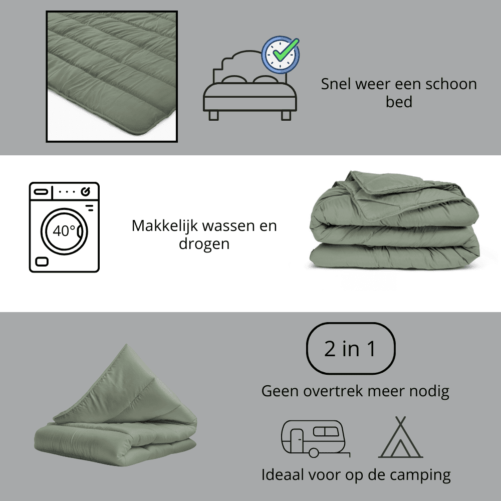 - Perfecte pasvorm: Het geïntegreerde overtrek zit altijd strak om het dekbed, zonder verschuivingen of bochten.