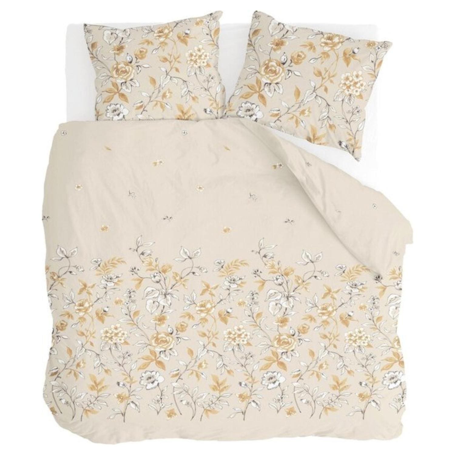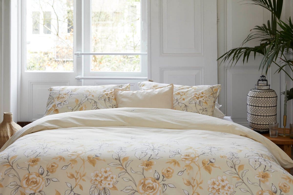 Het rustgevende bloemenmotief van rozen in beige en zandtinten is subtiel, stijlvol en tijdloos. Dankzij de duurzame printtechniek blijft het design intens en kleurecht, nacht na nacht.